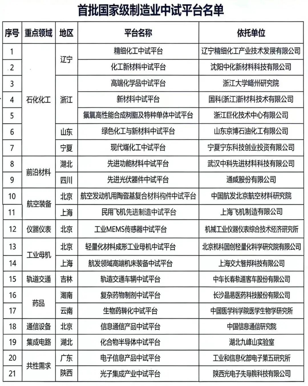 据山东省人民政府消息,工业和信息化部近日发布首批国家级制造业中试平台名单,会上发布了首批国家级制造业中试平台名单,全国共有21家平台入选,分布在石化化工、前沿材料、仪器仪表、通信设备、工业母机等多个领域。
