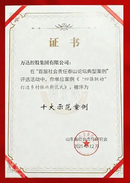 多年来,万达集团始终秉持“实业报国,奉献社会”的企业使命,积极参与中国光彩行、抗震救灾、脱贫攻坚、乡村振兴等社会公益事业,赡养和安置社会四残人员1000余人,为产业上下游提供就业10万余人,并连续14年冠名赞助黄河口(东营)国际马拉松赛,先后荣获全国“万企帮万村”精准扶贫行动先进民营企业、中国最具社会责任企业、中国红十字会奉献奖章、山东省履行社会责任示范企业等荣誉称号,赢得了各级党委政府和社会各界的高度认可。下一步,万达集团将持续深化社会责任实践,积极探索企业高质量发展与社会价值创造协同共进的新路径,为全面推进乡村振兴、助力共同富裕贡献更多“万达智慧”与“万达力量”。