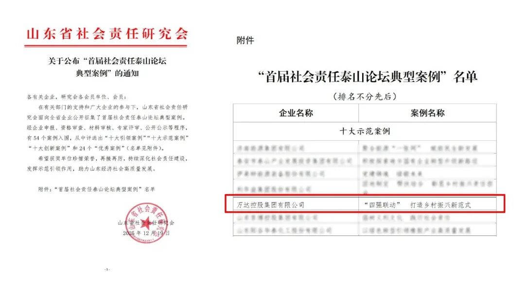 12月20日,以“责任重于泰山,创新引领未来”为主题的首届社会责任泰山论坛在济南举行。在论坛典型案例发布环节,我会常务会长单位、万达控股集团有限公司申报的《“四强联动” 打造乡村振兴新范式》案例,凭借其突出的实践成效与示范价值,成功入选全省首届社会责任泰山论坛“十大示范案例”。