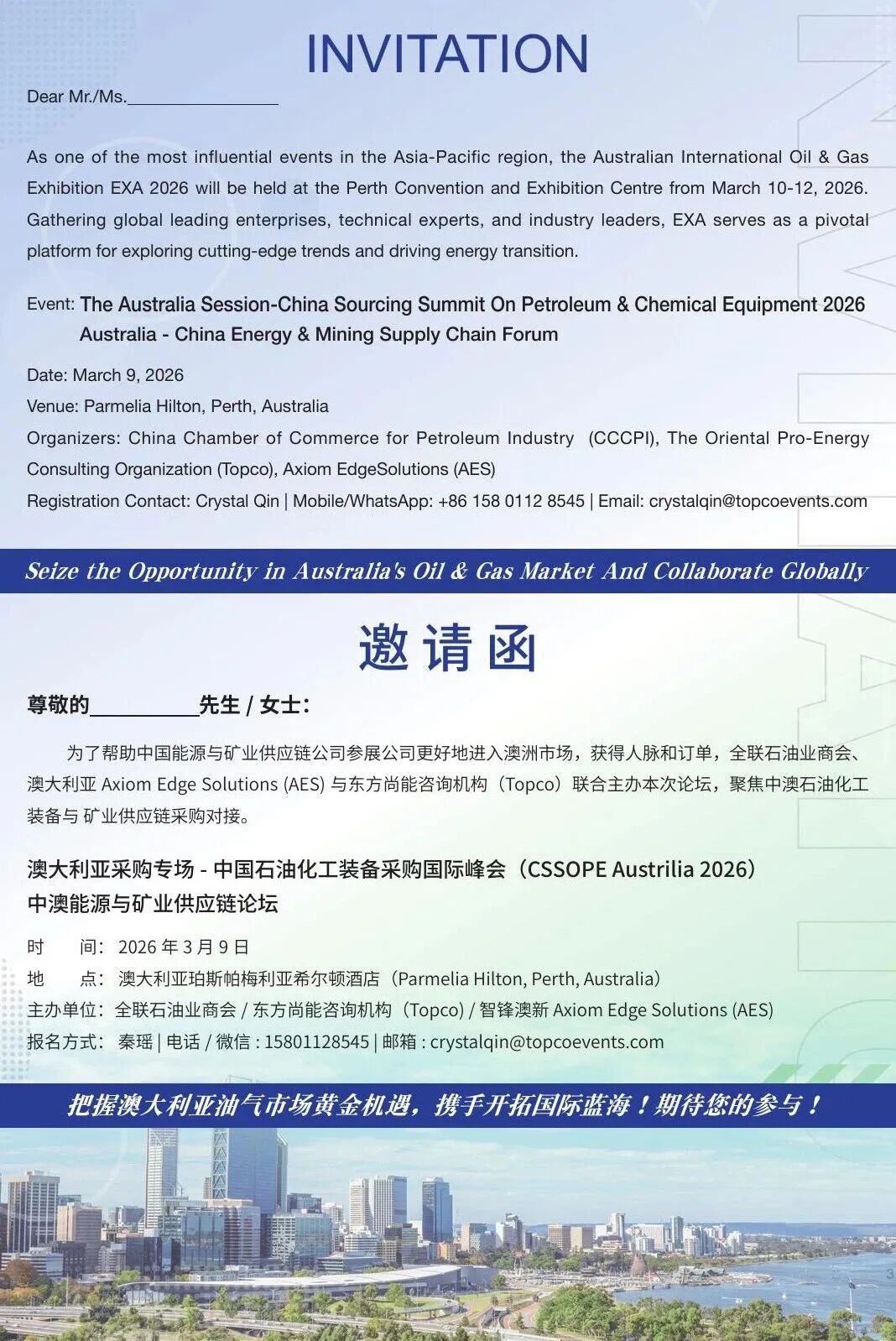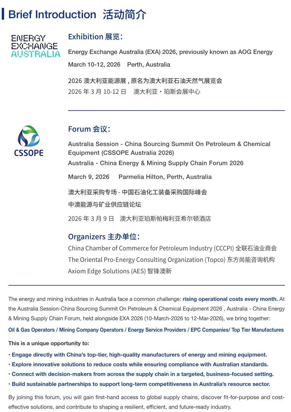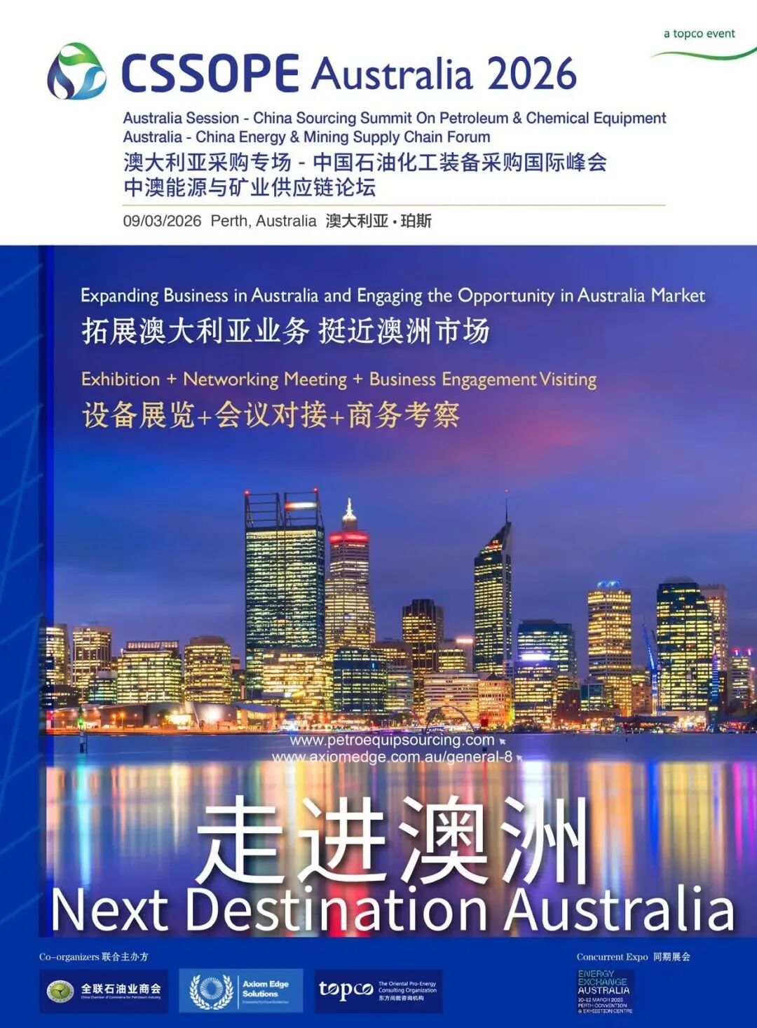 2026 年 3 月 10 日 - 12 日,由全联石油业商会、东方尚能咨询机构、澳大利亚AES 智锋澳新公司主办的 “CSSOPE 澳大利亚采购专场 / 中澳能源与矿业供应链论坛”在澳大利亚珀斯国际会展中心举办。论坛将与2026 年澳大利亚石油天然气展览会(EXA) 同期联动,为中国能源企业布局亚太市场搭建高价值对接平台。