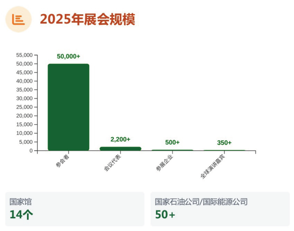 2025年埃及国际石油展展馆面积39,000平方米,共设有13个国家馆,来自120多个国家的25个国家石油公司到访展会,参展商500余名,观众高达40,000人次。