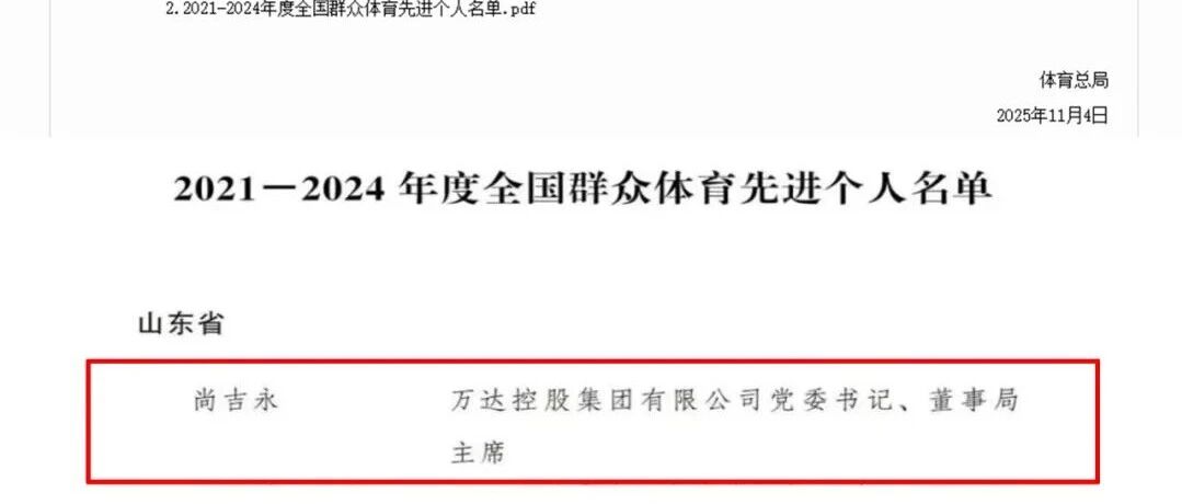 近日,国家体育总局正式下发《关于表彰2021-2024年度全国群众体育先进单位和先进个人的决定》,万达集团党委