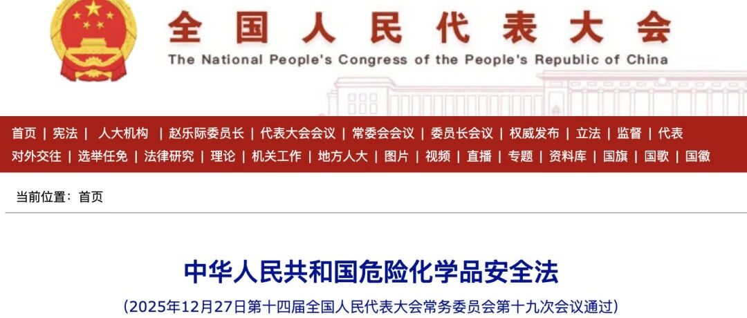 十四届全国人大常委会第十九次会议2025年12月27日表决通过危险化学品安全法,自2026年5月1日起施行。